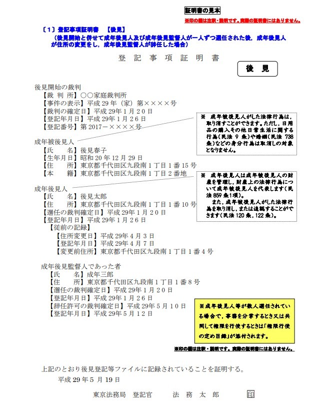 なお、成年後見監督人が選任された場合や、複数人の成年後見人が共同で職務を行う場合など、特別な事情がある場合にはその旨も記載されます。